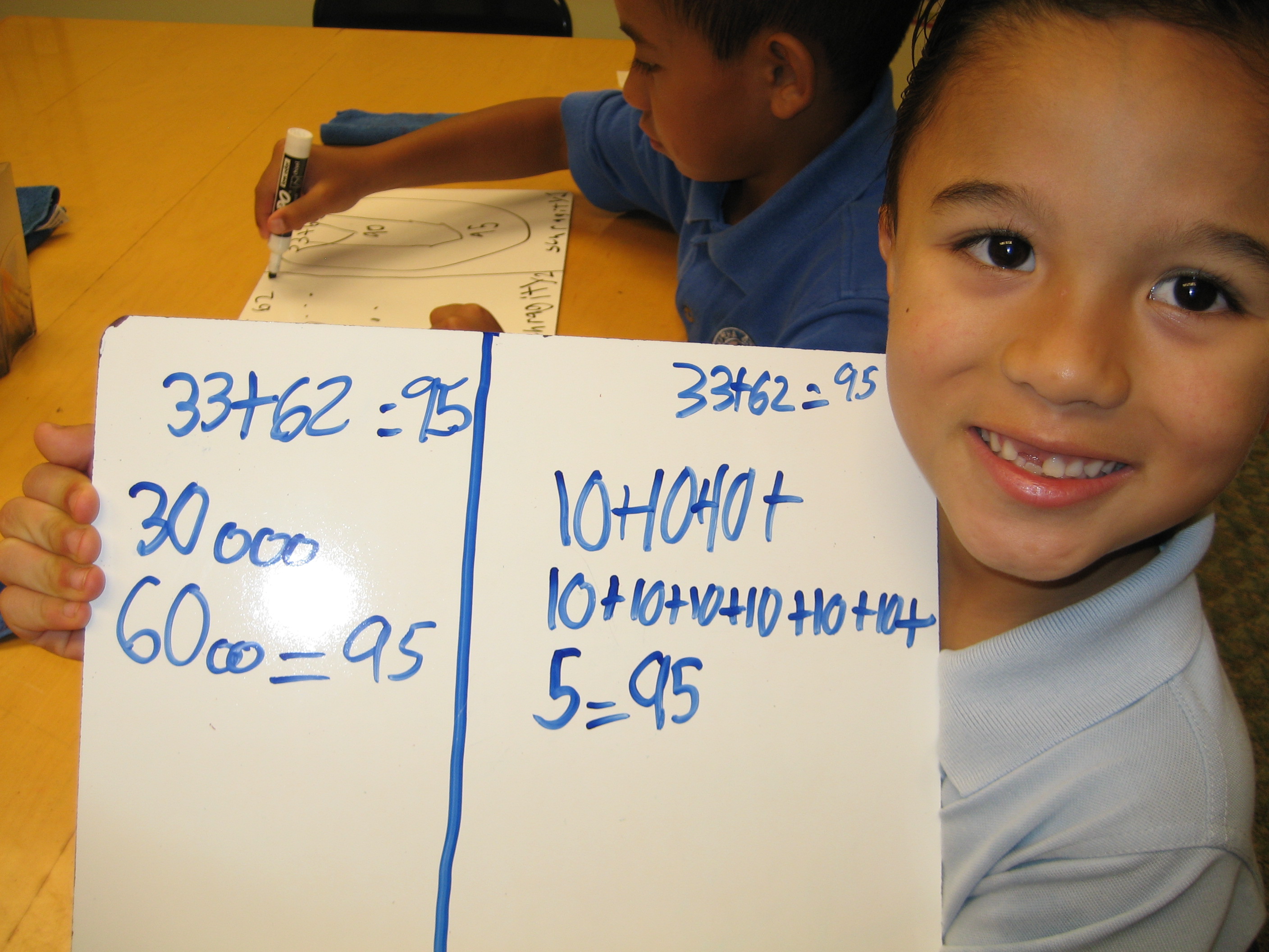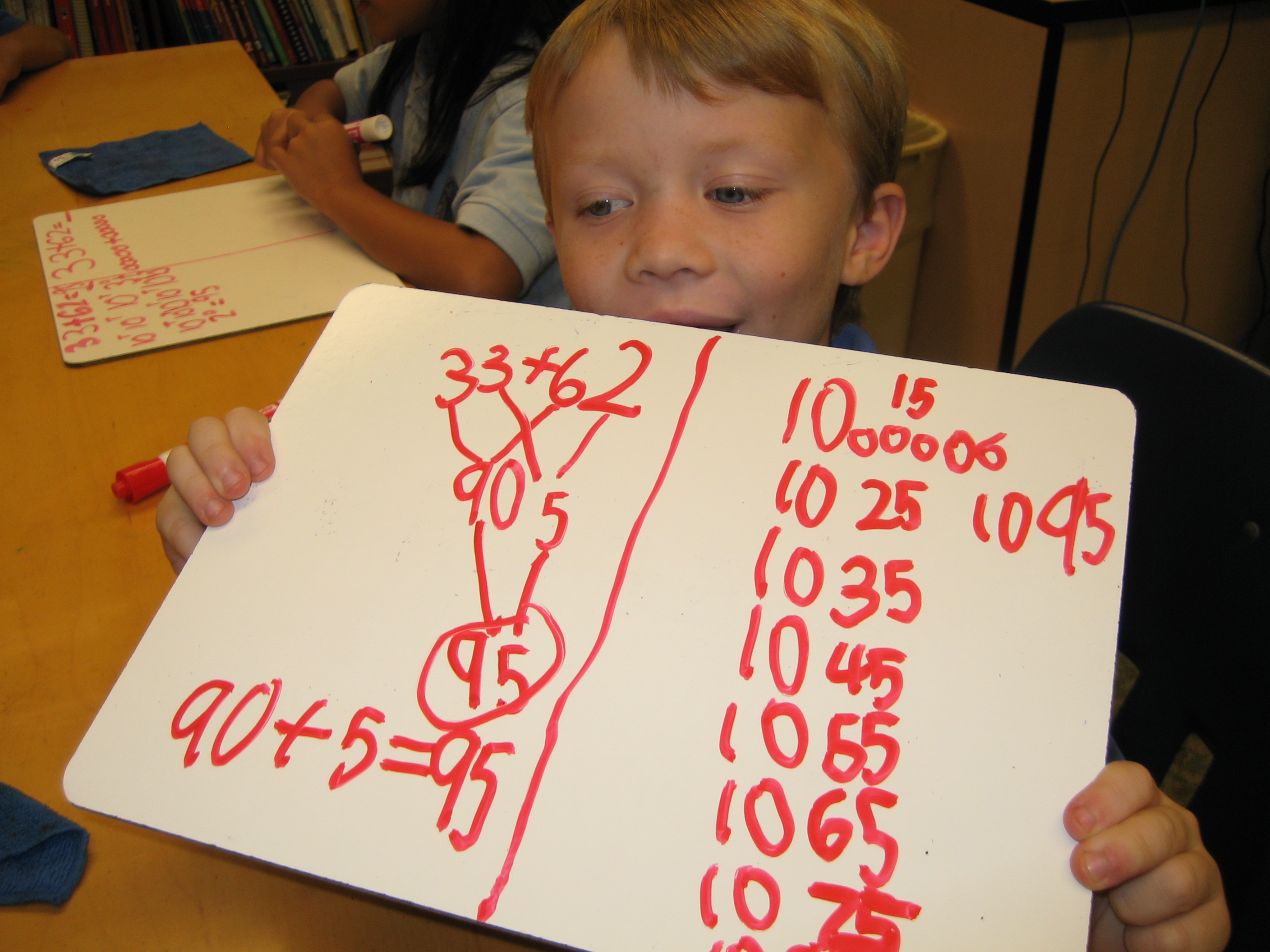 Here are some first graders from my math group who are learning to add larger 2 digit numbers without regrouping. They use a strategy that keeps the numbers whole and allows them to clearly understand their place value.