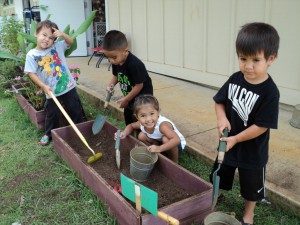 This picture shows some keiki in the Dirt Digging Area.  This outdoor center provides an area where child can not only dig, but can explore the properties of soil.  It also allows children to practice being safe with the tools and with the dirt.
