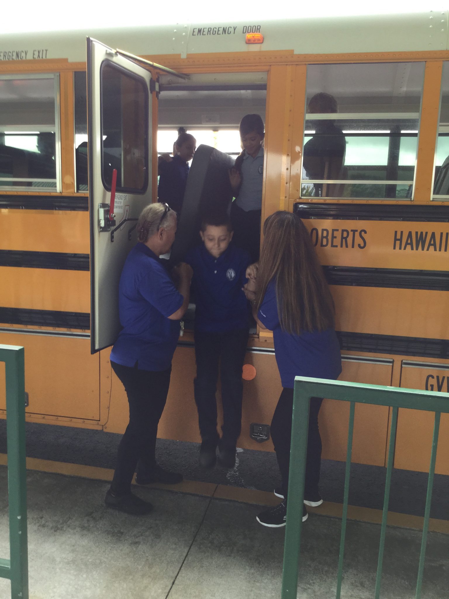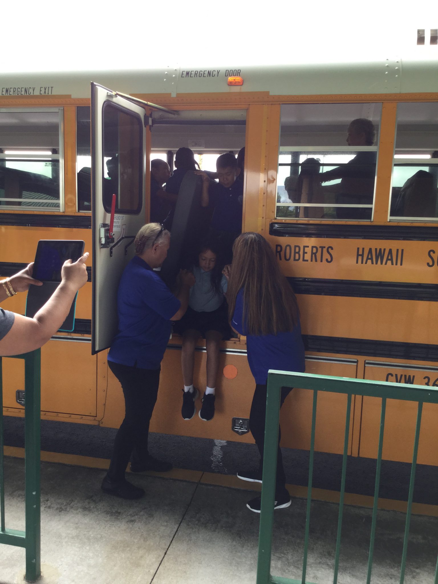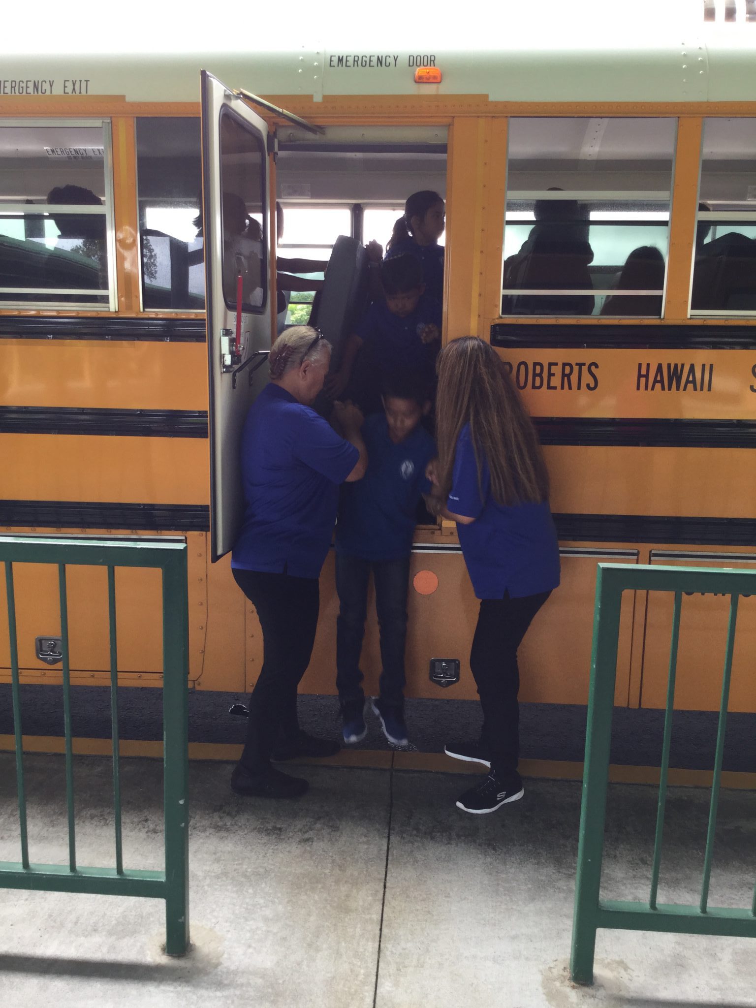 This morning, everyone participated in our annual Bus Evacuation Drill. Students were reminded of what to do in case of an emergency on the bus. We mahalo all of our aunties and uncles who take care of us by bringing us to school, taking us home or taking us on a huakaʻi safely!