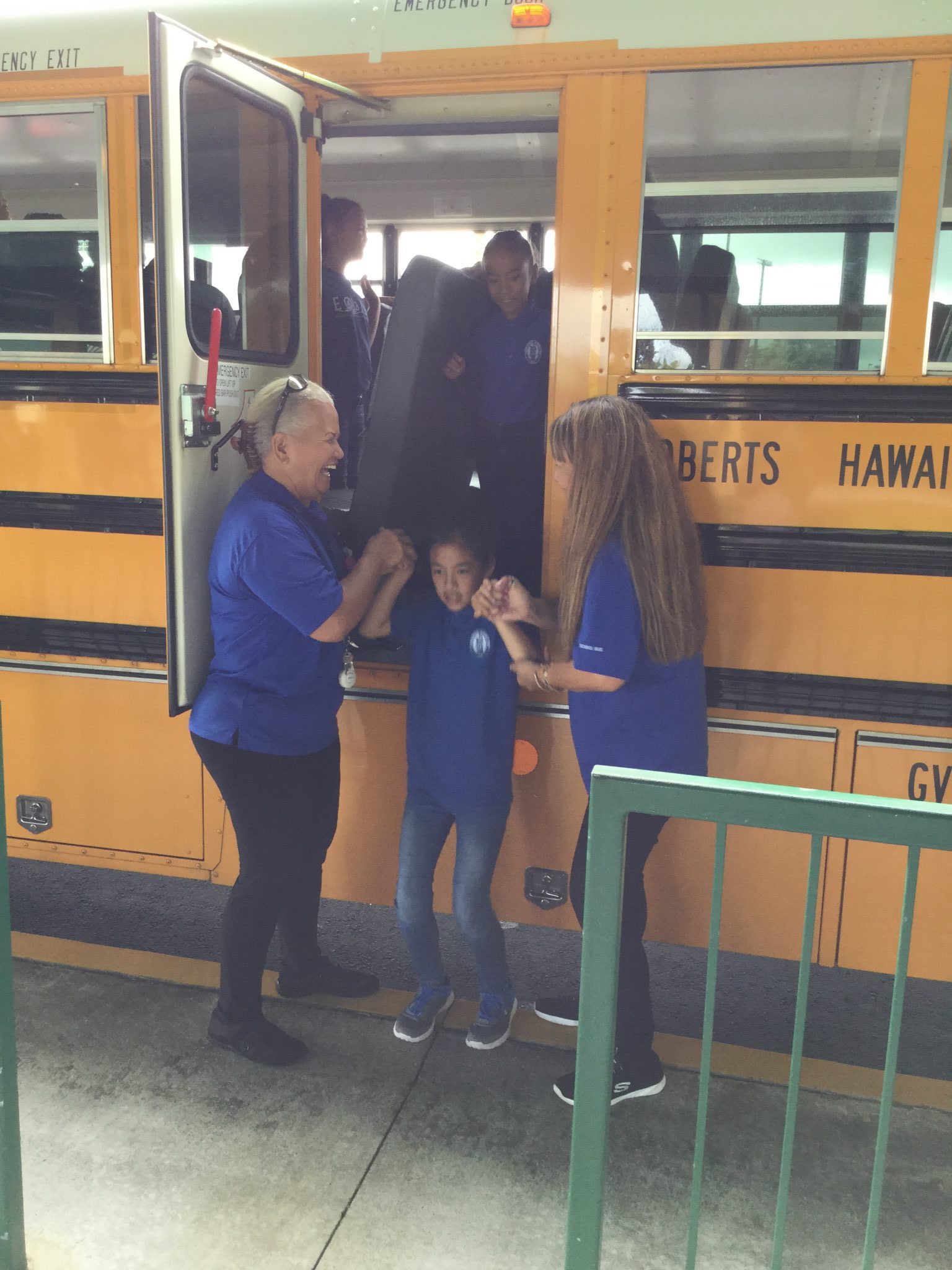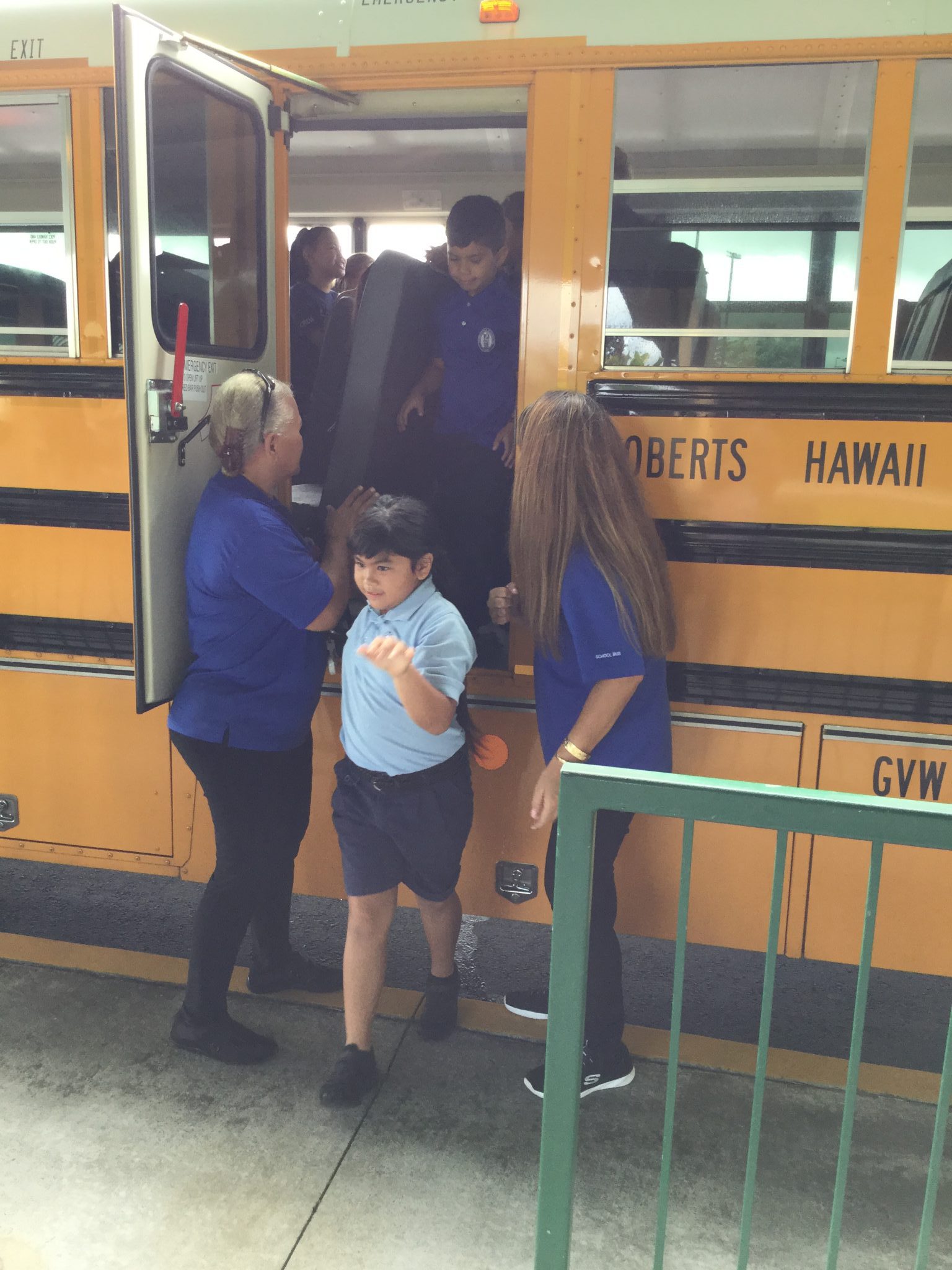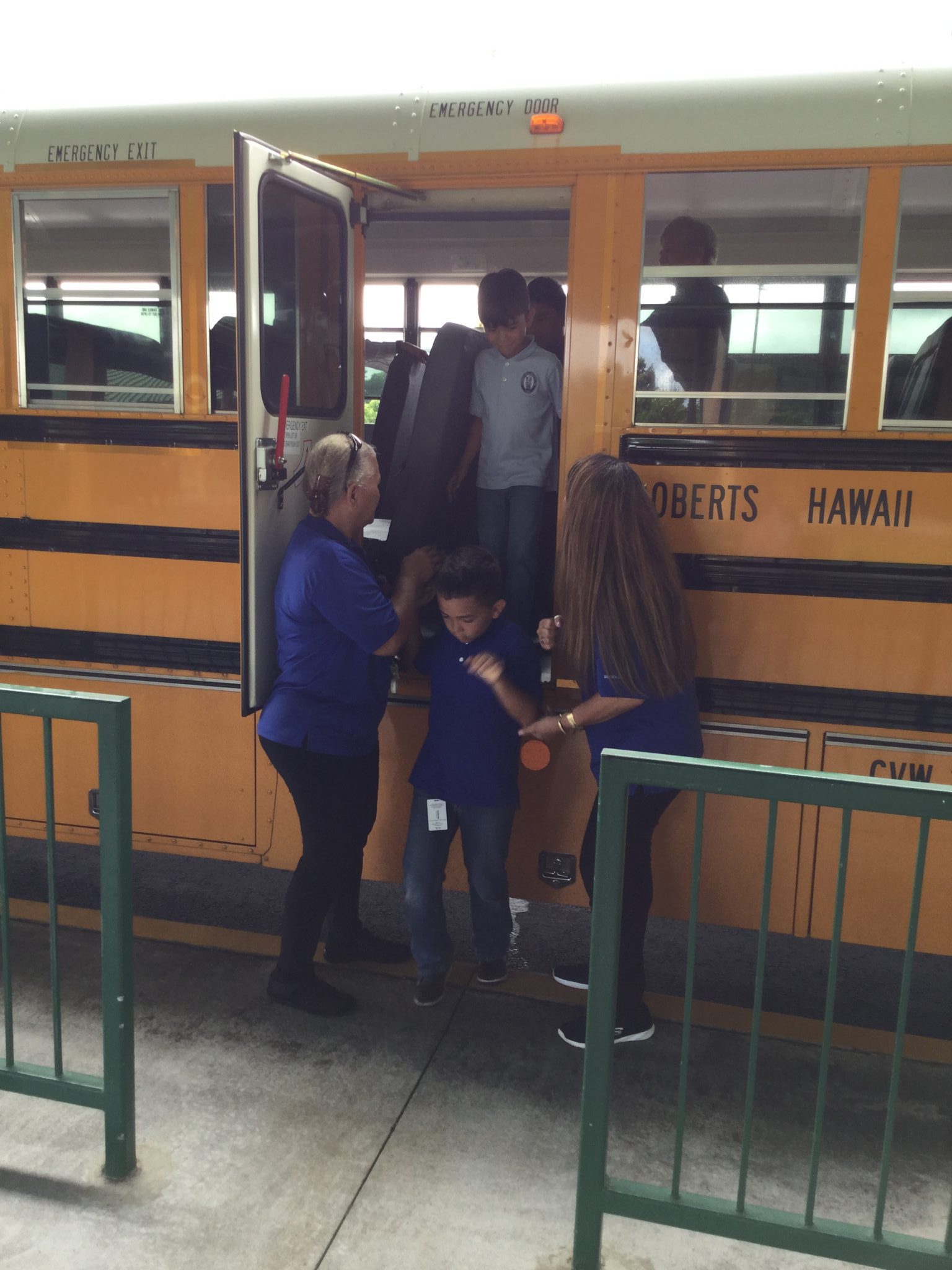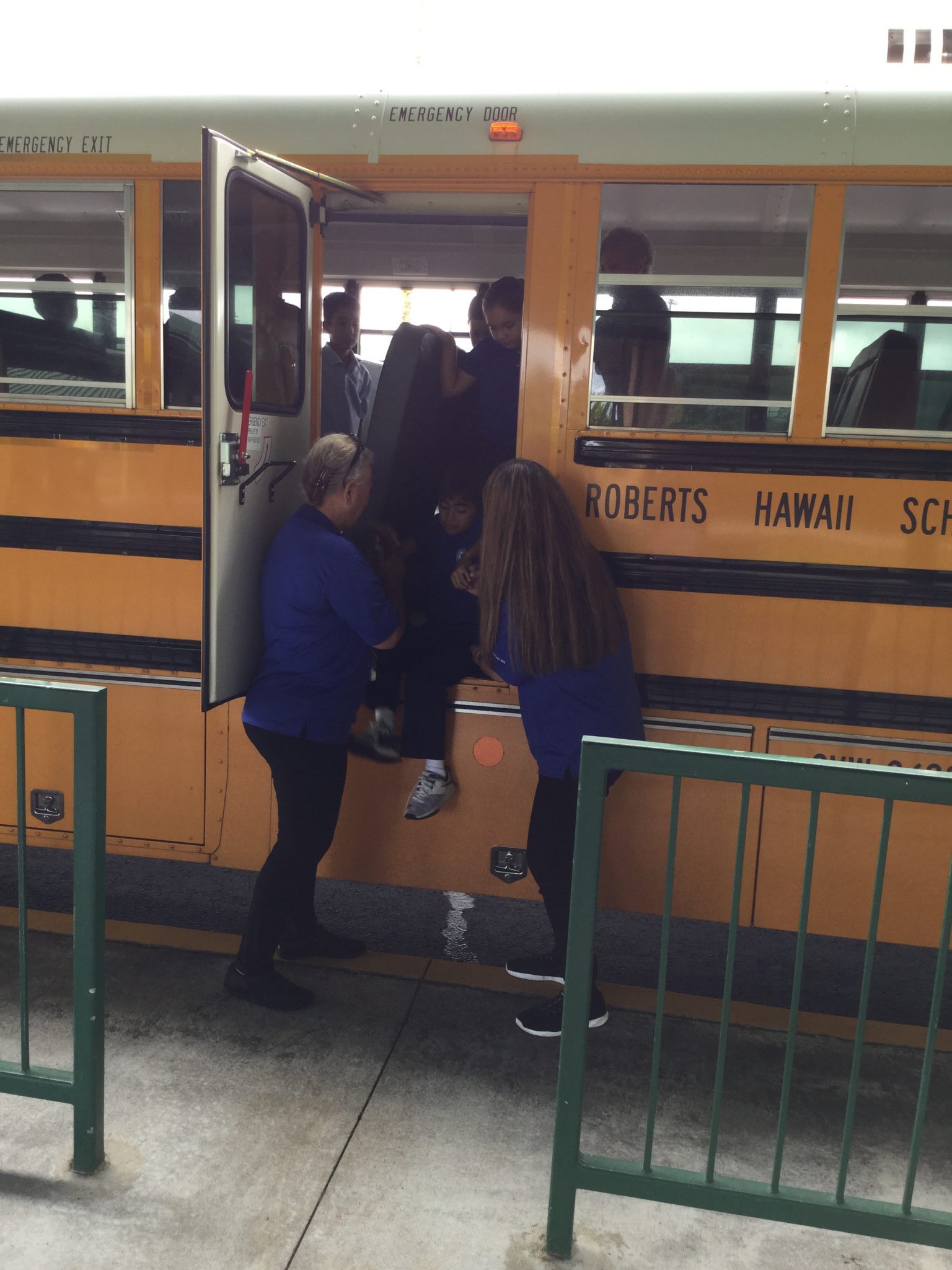 This morning, everyone participated in our annual Bus Evacuation Drill. Students were reminded of what to do in case of an emergency on the bus. We mahalo all of our aunties and uncles who take care of us by bringing us to school, taking us home or taking us on a huakaʻi safely!