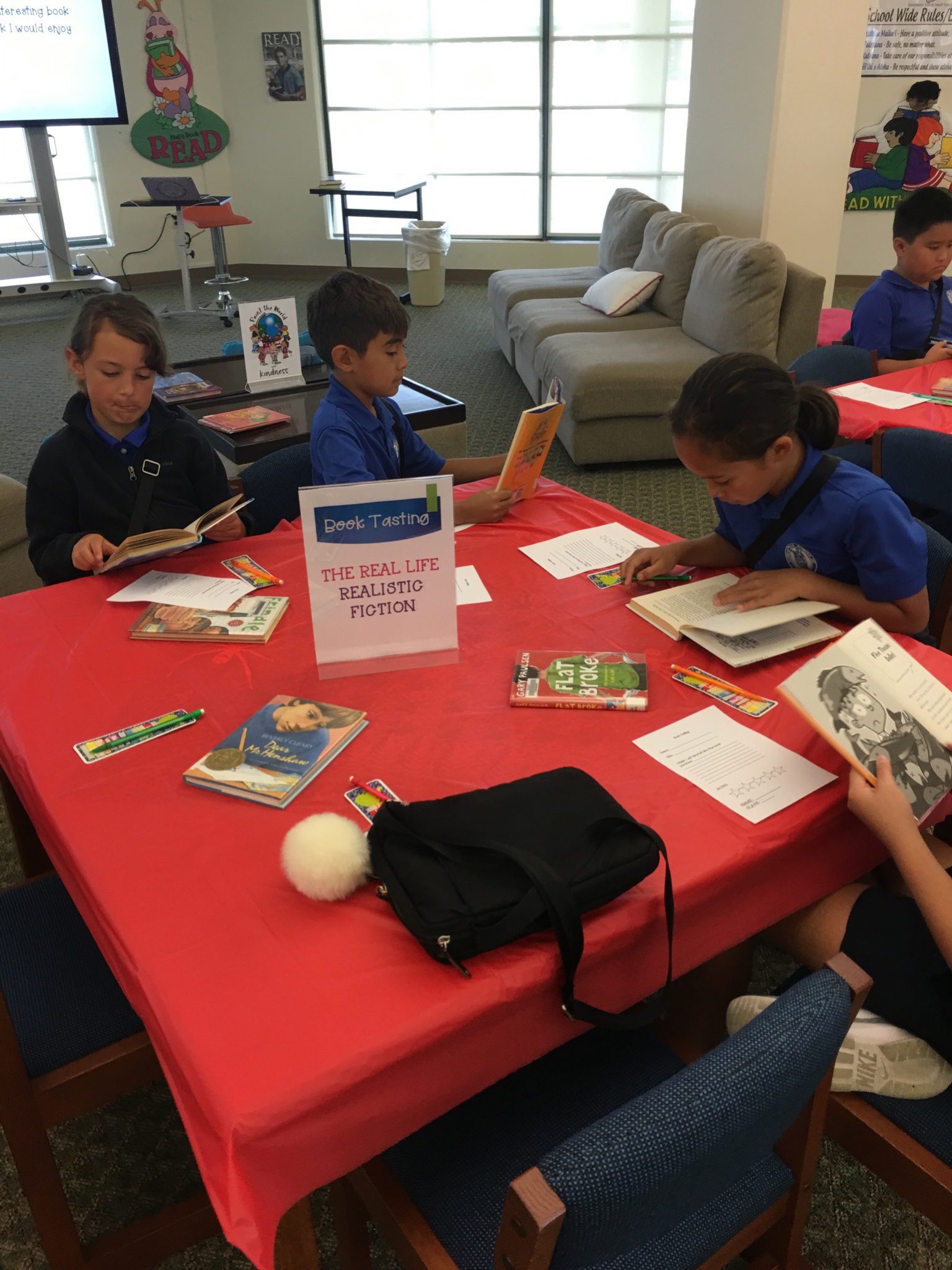 Have you ever tasted a book? Papa ‘Ekolu Haumāna got a taste of realistic books on their visit to the library this week. Kumu Kanani’s lesson focused on identifying books in this genre. Students “tasted” different books by skimming and scanning a variety of realistic fiction novels. Then they rated their books and shared what they liked or didn’t like about the story they reviewed.