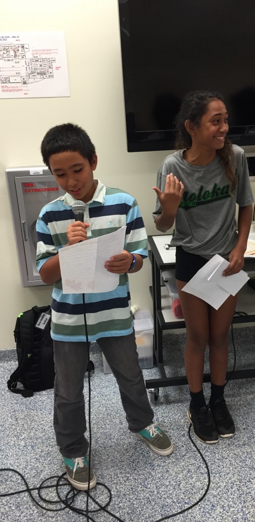 From left, Keala demonstrates his patented “turkey call;” Trajan shares his mad lib — with a quartet of fellow students hanging on his every word … and finally …
