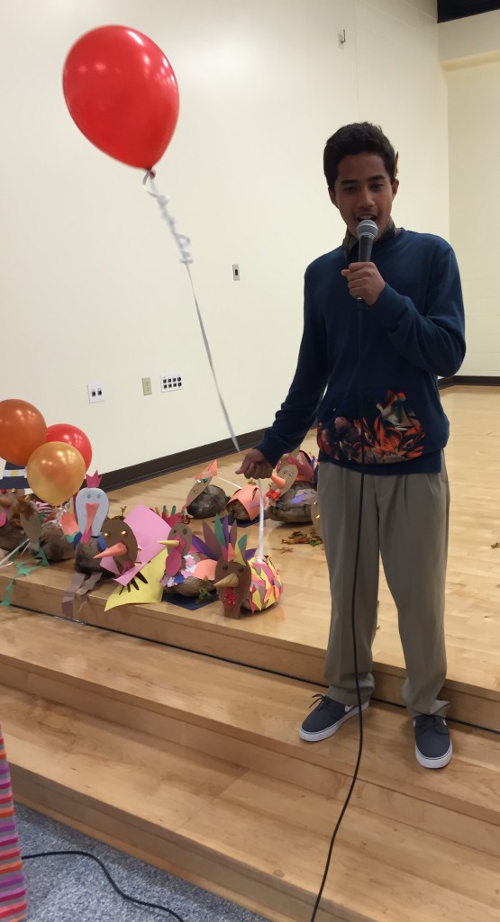 Above (from left to right): Jaymin reads his Thanksgiving madlib much to the delight of a fellow student; Five youngsters judge the best “turkey” on the stage in the foreground. There were about 10 turkeys in total; Students and Mrs. Ho decorate said turkey on a coconut using construction paper, scissors, balloons, candy, and their imagination.