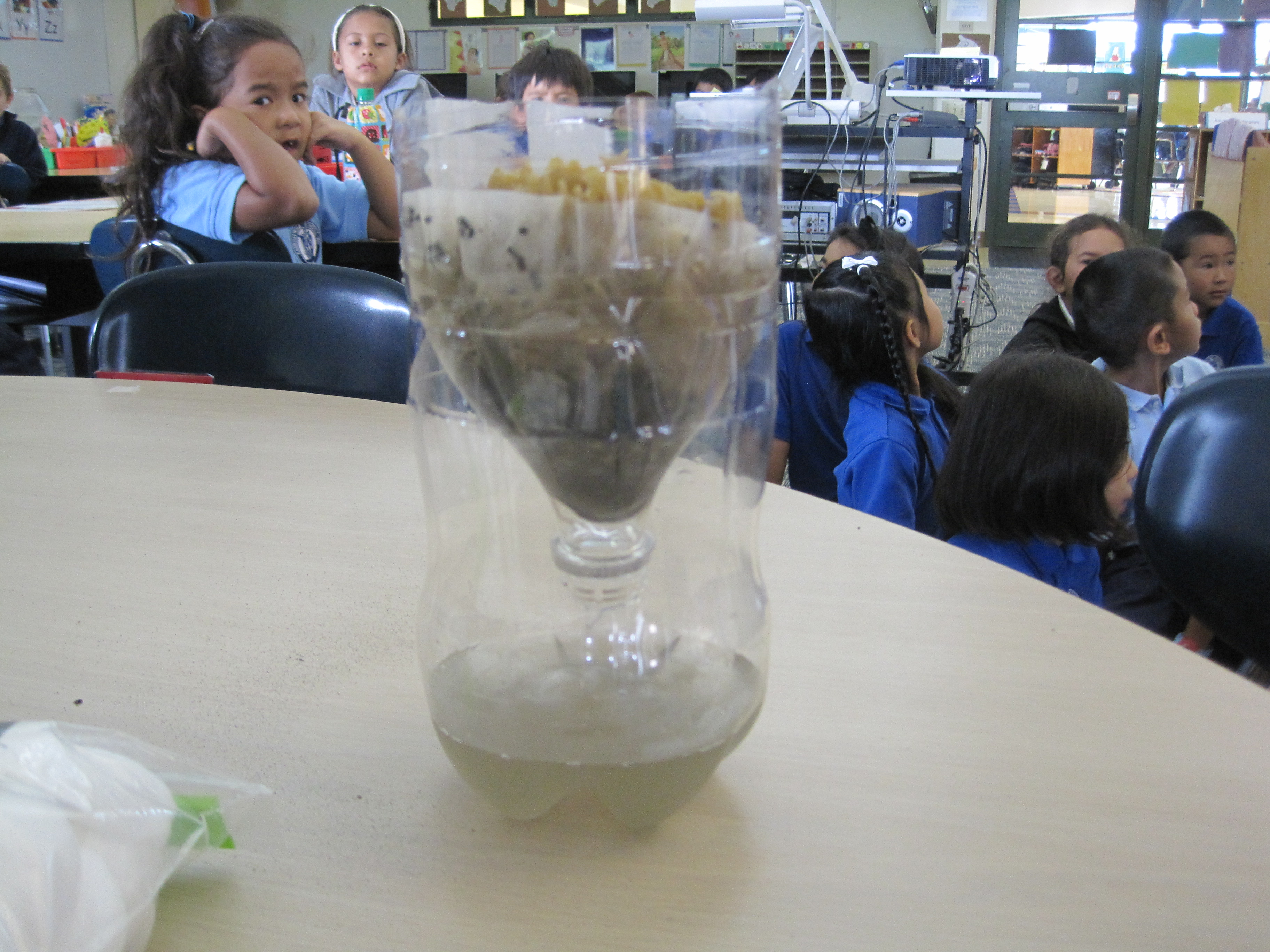 We have been learning about the moku of Puna for the last few weeks. We know the geographical location of the area, we are aware of common features of this place, and most recent learned what the name Puna means in reference to water. In our efforts to integrate our various areas of studies, we decided to create a science experiment. After watching a Youtube video on how Puna has natural water springs and aquifers in the area, we were intrigued by the process in which rain is made into drinking water. Therefore, we decided to make our very own filtrating bottles that somewhat resemble the process in which rain water goes through the Earth and ends into a well or aquifer, eventually becoming drinking water.
