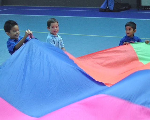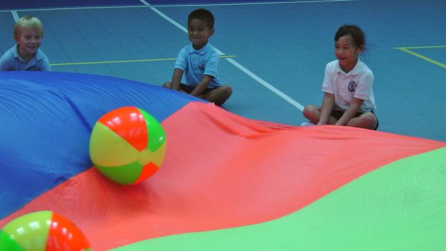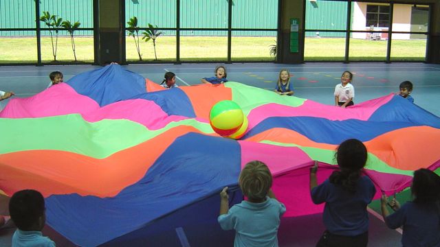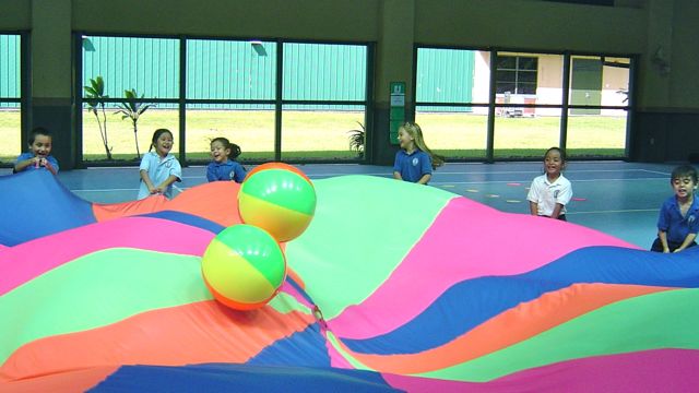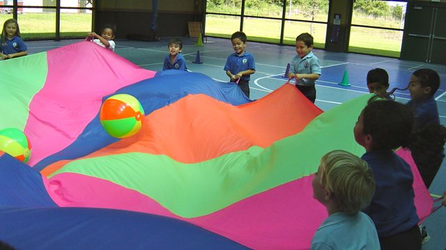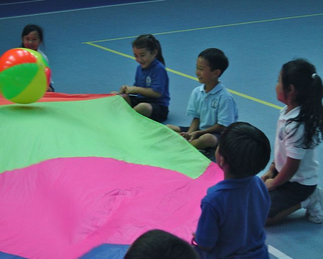Lower elementary students are working on parachute fun and fitness. Using the parachute can provide a good opportunity for a workout. Students learn about listening to precise instruction and following commands on demand in order for tasks to be done cooperatively. They are challenged with figuring out how to problem solve together to get balls off the parachute or to capture other students from under the parachute. Students enjoy using the parachute and are always excited to do specific tasks.