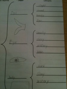Students use the brace map for envisioning “structures” and collect words and phrases (details and super details) for describing them. This process helps them attach meaning to the actual word when it is formally introduced.