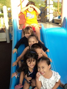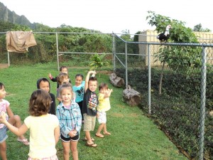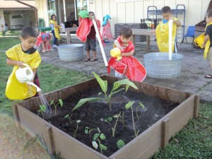We finally have kalo plants in our garden box by the Water Play area. Since that area is always wet and the children love using water cans there, we wanted to take advantage of the water and plant something that grows well in soaked ground. Aunty Trixy, one of our Extended Day teachers, donated some kalo plants that she had in her yard. If you have any kalo plants that you’d like to donate or have connections with people that have lo’i kalo, we would welcome more plants.