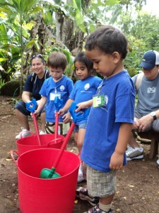 Yesterday at Waimea Valley, the children made a “magic potion” with Aunty Palapala. They used water, leaves, flowers, and herbs in a big container of water. She had the children stir the potion with a big spoon (shovel). Then, the children used a paintbrush to apply the “potion” to the surrounding plants. Today, we made our own magic potion with the plants from our garden. We used basil, mint, green onion, and impatient flowers and leaves.