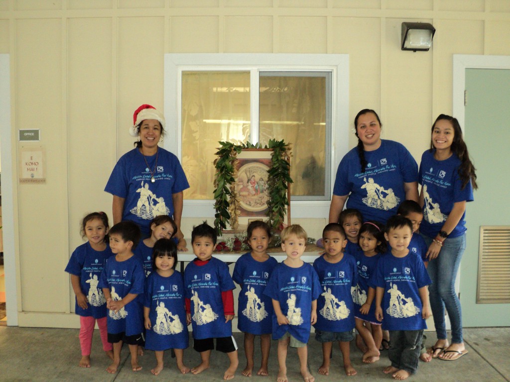 Today was our Founder’s Day Celebration. The entire school sang and prayed together. We also recited “A Pledge for Pauahi.” “We, the keiki of Kamehameha Schools and of Hawai’i nei, give our love to Ke Ali’i Pauahi. We will always remember her with kindness and respect. Mahalo, mahalo, mahalo e Kamehameha! Mahalo, mahalo, mahalo e Pauahi!” Our keiki received a special gift from Kamehameha Schools: a special edition T-shirt in honor of the 125th anniversary of our schools.