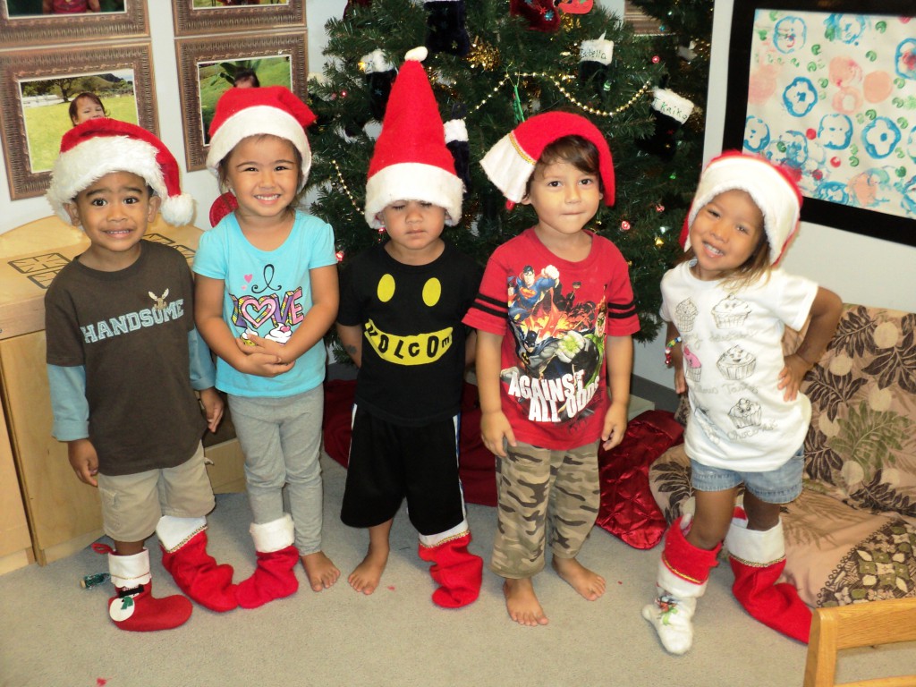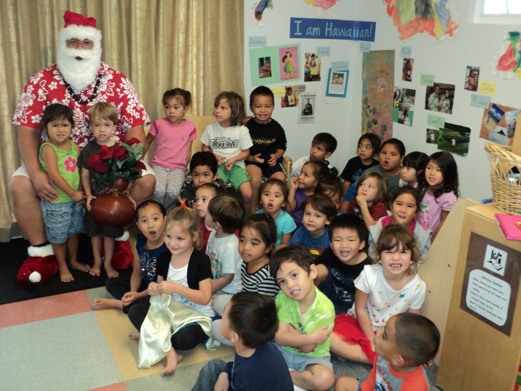 We had a visit from our Hawaiian Santa Claus. One child exclaimed, “You’re not Santa, you’re a man.” Another child said, “That’s not Santa, that’s Uncle Brian” Some of our three year old children didn’t’ want to take a picture with Santa. At this age, many children are afraid of Santa. Think about it……a stranger with a white beard who says, “Ho, Ho, Ho.” It’s perfectly normal for young children to be afraid of Santa, as well as other costumed characters. Children eventually outgrow their fear of Santa and may want to take a photo with him when they are older. Don’t force your child to approach Santa and allow your child to approach him at his/her own pace.