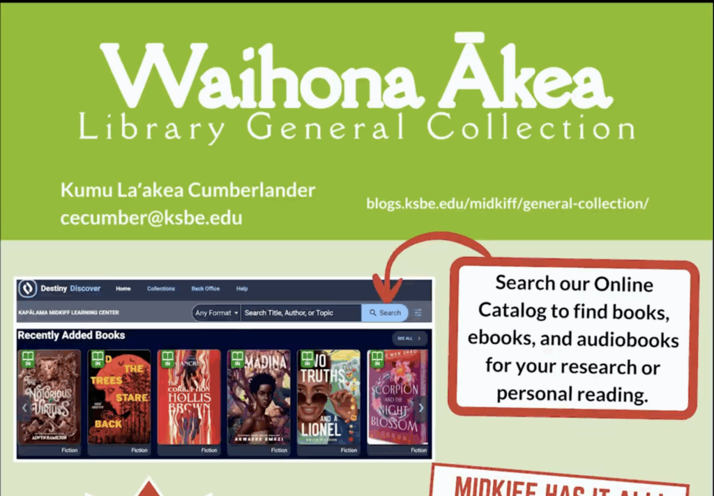 Waihona Ākea (Library General Collection) on the main floor of the Midkiff Learning Center (Hale Hoʻonaʻauao ʻo Midkiff) provides resources in print and digital formats and services that prepare our haumāna for college and life-long learning, including gathering and evaluating ʻike, exploring and informing passions, and supporting academic and personal growth.